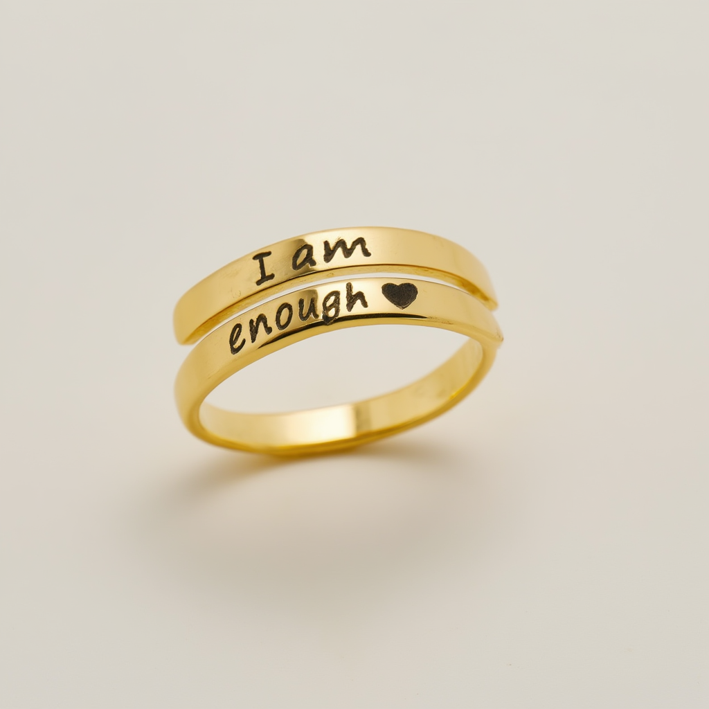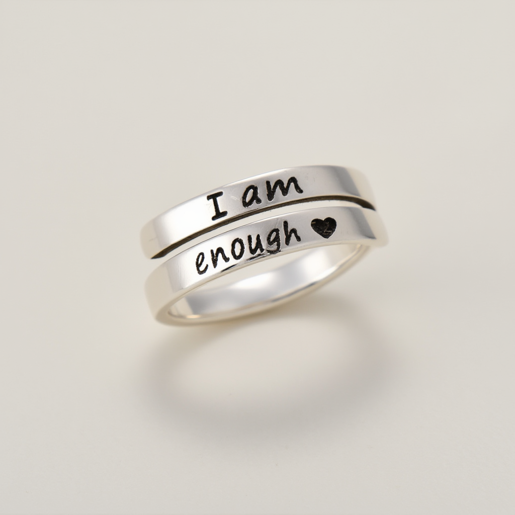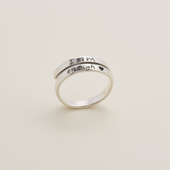 The Enough Ring features a clean, minimal band engraved with a single word. Designed for everyday wear, it’s comfortable, lightweight, and easy to integrate into daily routines.